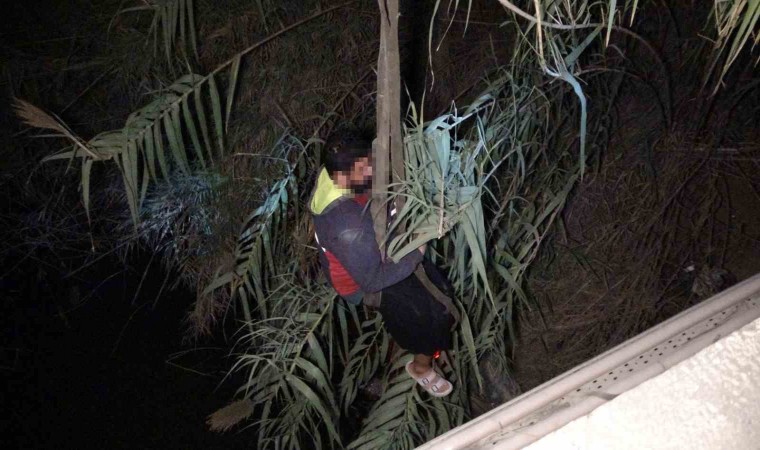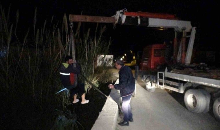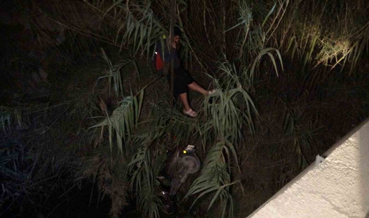 Antalya’nın Manavgat ilçesinde kanala uçarak yaralanan motosiklet sürücüsünün 1,93 promil alkollü olduğu belirlenirken, kanaldaki motosiklet vincin halatına oturan görevli tarafından halata bağlanarak kanaldan çıkarıldı.