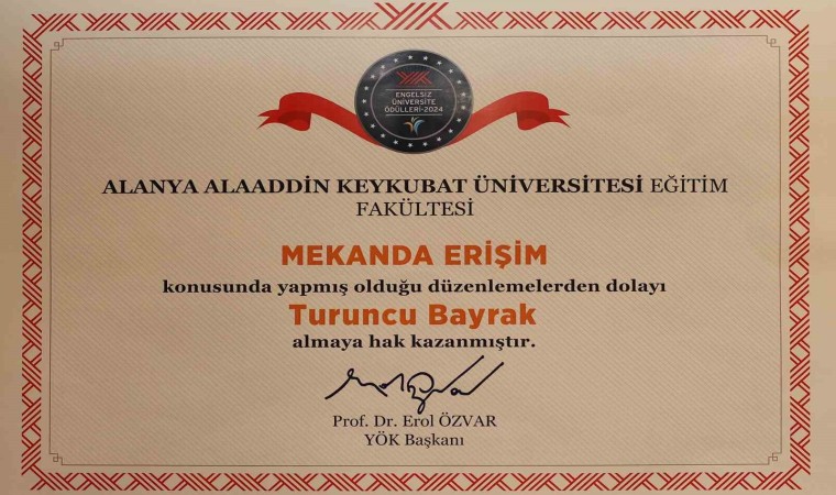 Alanya Alaaddin Keykubat Üniversitesi (alkü), akademik başarılar ve bilimsel projelerinin yanında çevre ve insan yaşamına dair alanlarda da yaptığı çalışmalarla ödül almayı sürdürüyor. alkü eğitim fakültesi, engelli bireylerin eğitim ve kampüs yaşamına tam katılımını sağlamak adına yürüttüğü çalışmalarla “turuncu bayrak” ödülü aldı.