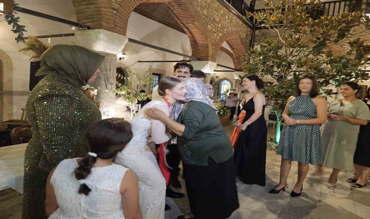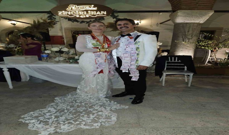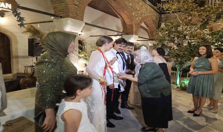 Gecenin ilerleyen saatlerine kadar devam eden düğünde davetliler Türk geleneklerine kısa sürede ayak uyduran geline para takıp genç çifte ‘mutluluk’ diledi.