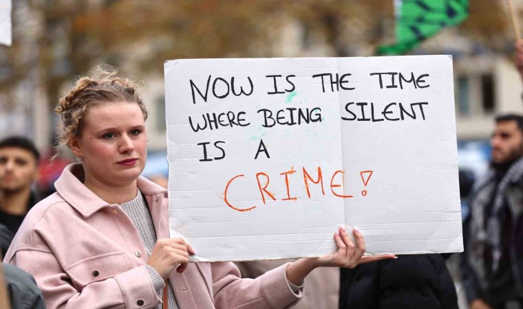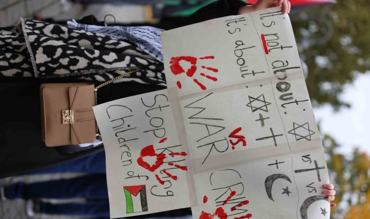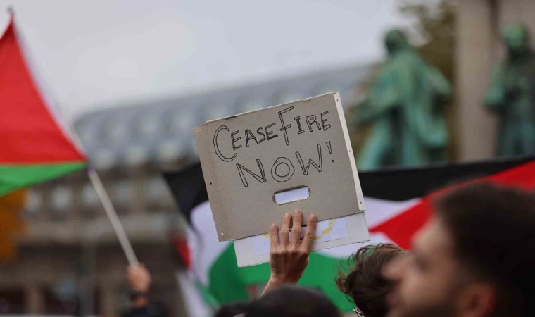 Ellerinde Filistin bayrakları taşıyan göstericiler, “Özgür Filistin” ve “Bombardımanı durdurun“ sloganları atarak, “Ateşkes”, “Gazze’ye özgürlük” ve “Savaşı durdurun” yazılı pankartlar açtı.