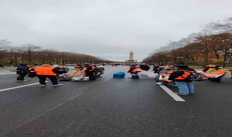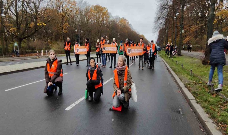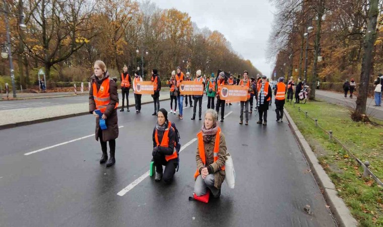Almanya’nın başkenti Berlin’de federal hükümetin bir an önce fosil yakıt kullanımından çıkmasını isteyen Son Nesil protestocuları Zafer Anıtı’nın önündeki 17 Juni Caddesi’nde oturma eylemi gerçekleştirdi.
