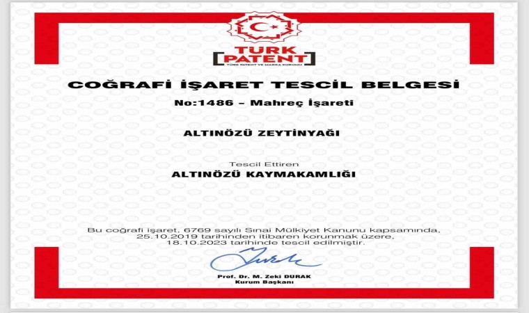 Hatay’ın Altınözü ilçesinde üretilen zeytinyağı, coğrafi işaret tescil belgesini aldı.
