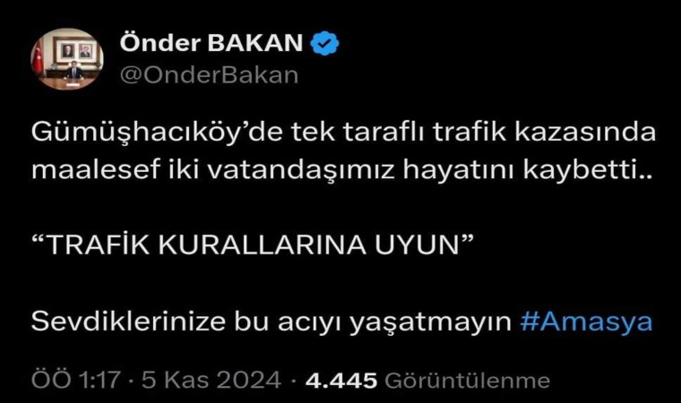 Amasya’nın Gümüşhacıköy ilçesinde alkollü sürücünün kullandığı otomobil, ağaca çarparak parçalandı. Amasya Valisi Önder Bakan, “Sevdiklerinize bu acıyı yaşatmayın” notuyla kazada 2 kişinin hayatını kaybettiğini paylaştı. Vali Önder Bakan, “Gümüşhacıköy’de tek taraflı trafik kazasında maalesef iki vatandaşımız hayatını kaybetti. Trafik kurallarına uyun. Sevdiklerinize bu acıyı yaşatmayın” değerlendirmesinde bulundu.