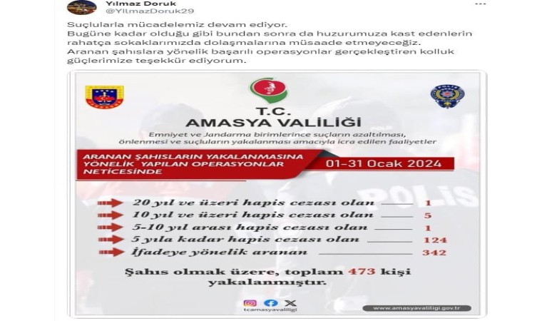 Suçların azaltılması, önlenmesi ve suçluların yakalanmasına yönelik operasyonlar yapan Amasya Emniyet Müdürlüğü ile Amasya İl Jandarma Komutanlığı ekiplerini kutlayan Yılmaz Doruk, “Aranan şahıslara yönelik başarılı operasyonlar gerçekleştiren kolluk güçlerimize teşekkür ediyorum” diye konuştu.