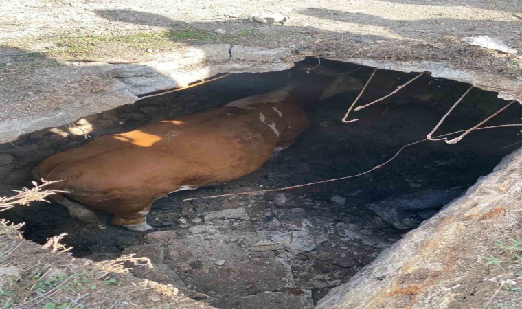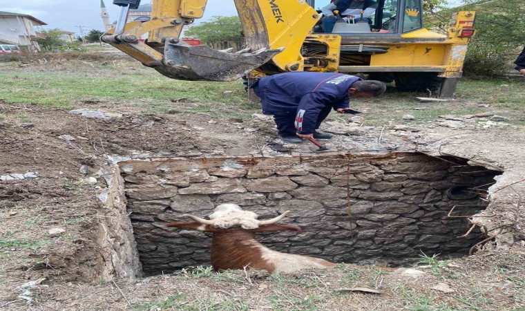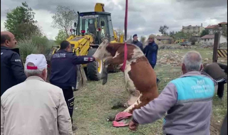 Amasya’da bir köyde üstü açık haldeki çukura düşen inek, ekiplerin çabaları sonucu vinç yardımıyla kurtarıldı.