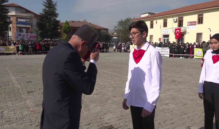 Amasya’da Cumhuriyet’in 100. yılı dolasıyla düzenlenen etkinlikte Kıbrıs gazisi Muammer Torun, üzerinde üniformasıyla Türk bayrağını torunlarına emanet etti.