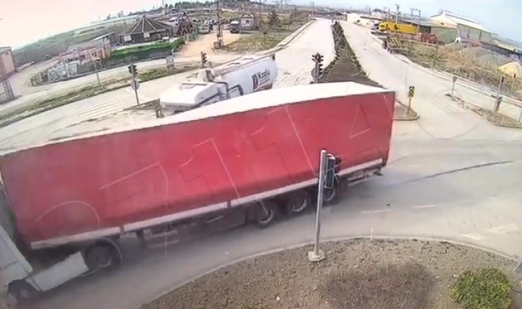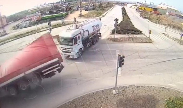 Amasya’nın Suluova ilçesinde facianın eşiğinden dönüldü. Kavşakta tırın önüne tanker çıktı. Tankere çarpmaktan ani manevrayla kurtulan tır yan yatarak devrildi. O anlar saniye saniye güvenlik kamerasına yansıdı.