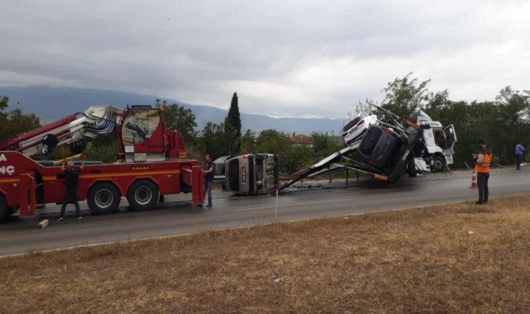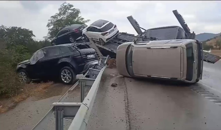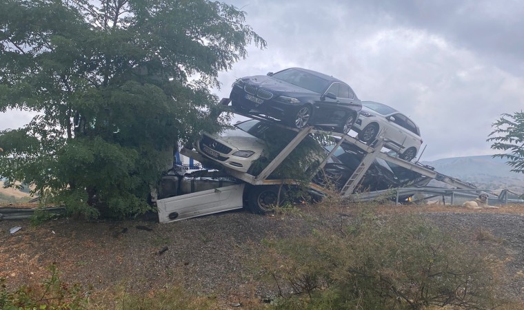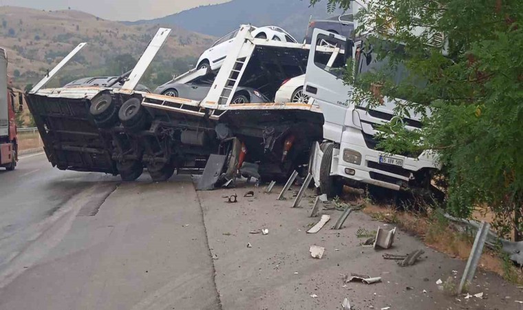 Amasya’nın Taşova ilçesinde lüks araçların yüklü olduğu tır, sürücüsünün direksiyon hakimiyetini kaybetmesi sonucu bariyerlere çarparak savruldu. Sürücünün yaralandığı feci kazada 2 araç yola devrildi, büyük çapta maddi hasar oluştu.