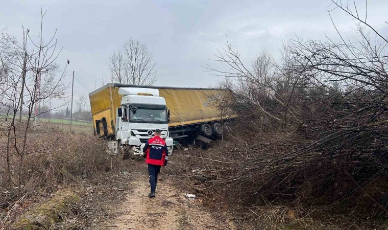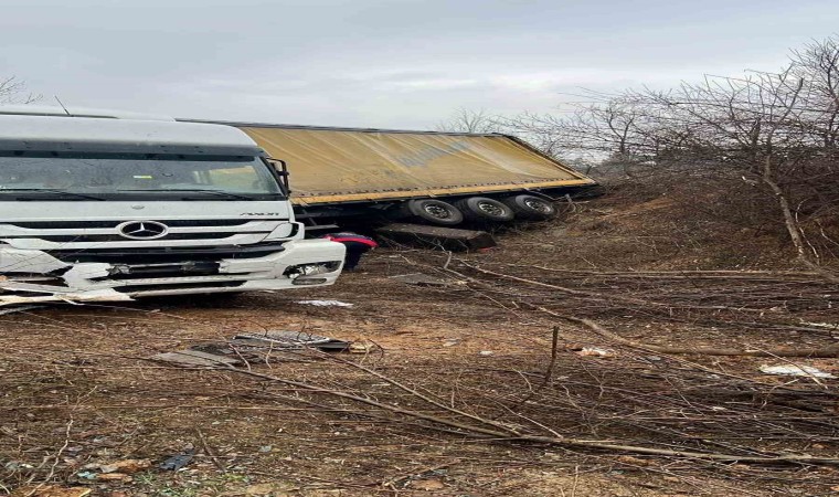 Amasya’da yağışlı yolda kontrolden çıkan tır yolun kıyısına devrildi. Tır sürücüsü kazada yaralandı.