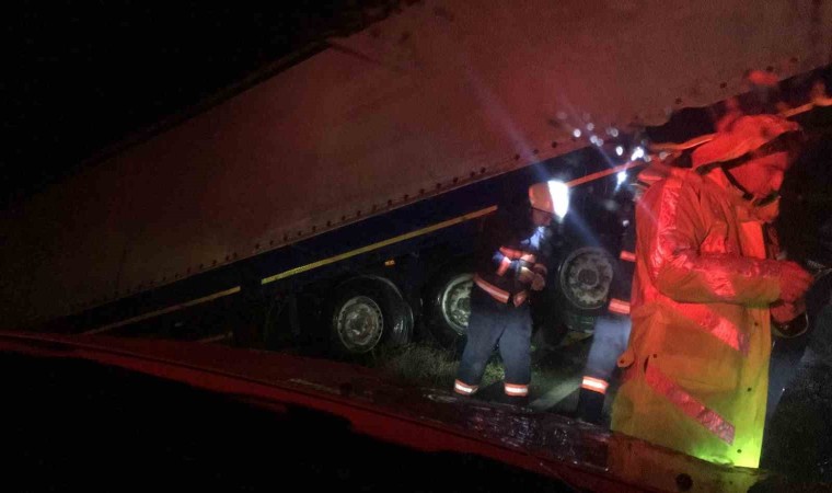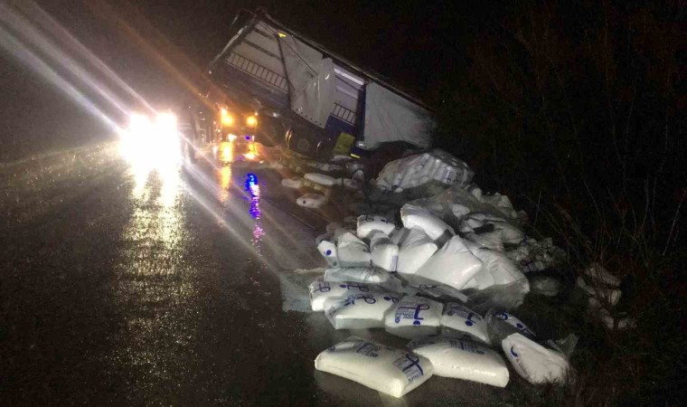 Amasya’da yağışlı yolda kontrolden çıkan tır, yağmur suyu kanalına daldı. Dorse kısmındaki plastik ham maddesi dolu çuvallar yola savruldu.