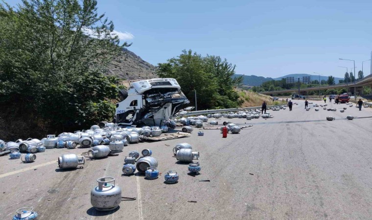 Amasya’da tüp yüklü kamyonun devrildiği kazada tüpler yola saçılırken, sürücü ise ağır yaralandı. Kaza anı ise güvenlik kamerasına yansıdı.