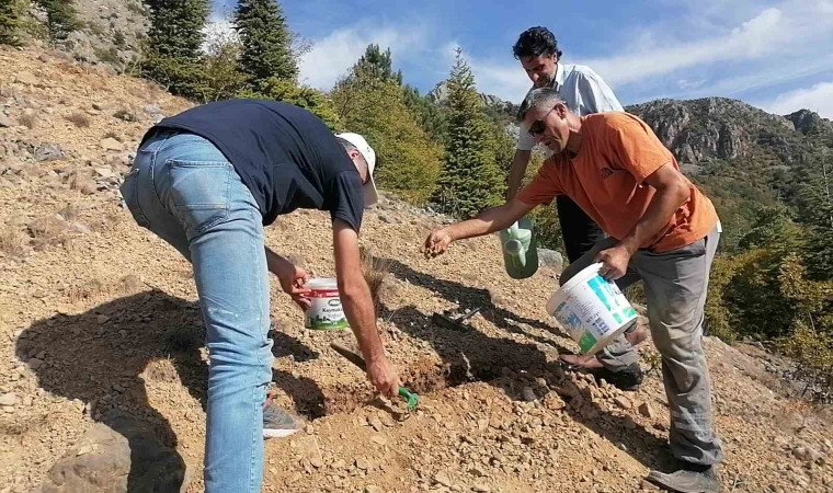 Şehrin zirvesindeki Çakallar Mahallesi’nde meşe ağaçlarının bulunduğu alana giden aile bireyleri, topladıkları tohumları kazma ve küreklerle kazdıkları boş alanlarda toprakla buluşturdu.