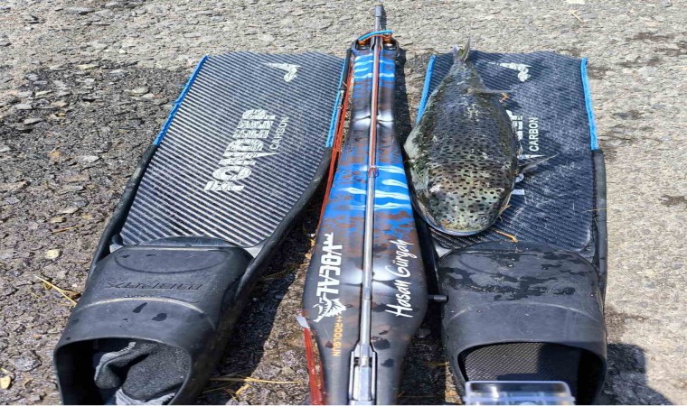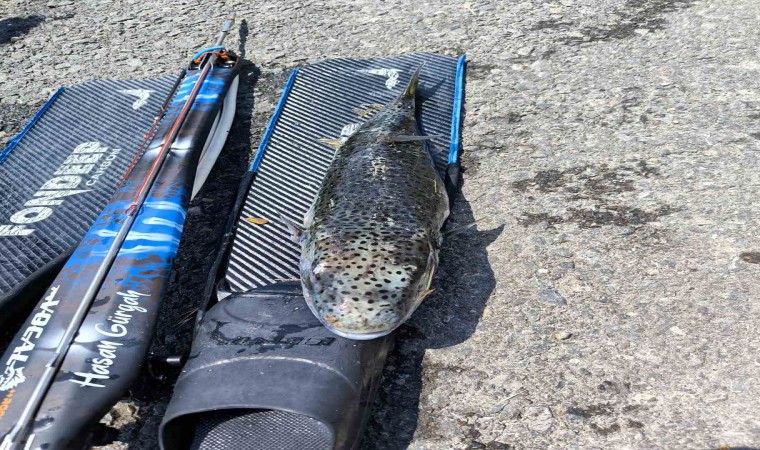 Mersin’de serbest dalış yapan Hasan Gürgah, zıpkınla yaklaşık 6 kiloluk ’benekli balon balığı’ avladı.