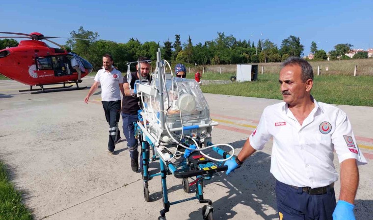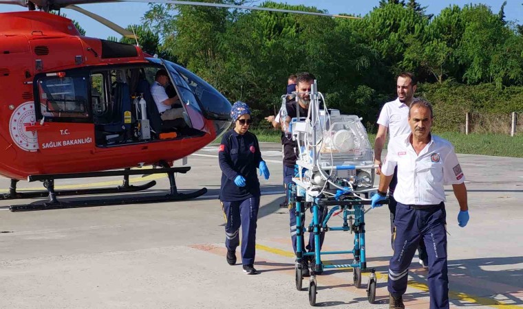 Samsun’da konuşlanan Sağlık Bakanlığına bağlı ambulans helikopter bölge insanına sağlık hizmeti vermeye devam ediyor. Samsun’un Vezirköprü ilçesinde ikamet eden 9 aylık Banu E. adlı kız bebek solunum sıkıntısı yüzünden ailesi tarafından Vezirköprü Devlet Hastanesine kaldırıldı. Bebeğin yenidoğan servisi yoğun bakımda tedavi altına alınması için Samsun’da yoğun bakım servisinde yer olan özel bir hastaneye sevkine karar verildi. Samsun’dan havalanan ambulans helikopter Vezirköprü Devlet Hastanesi yanındaki yola inerek kuvöz içindeki bebeği Samsun’daki hastaneye yetiştirdi.