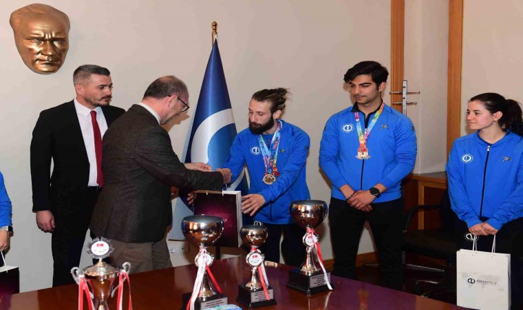 Erzurum Teknik Üniversitesi ev sahipliğinde gerçekleştirilen şampiyonadan 14 madalya ile dönen Anadolu Üniversitesi sporcuları Gülsena Karakuyulu Ertunç, Sergen Curabaz, Nazlı Taş, Büşra Özden, Ömer Doğukan Öztürk, Tevfikcan Ediş, Ahmet Aydın ve Taekwondo Takımı Sorumlusu Yıldırım Gezer kazandıkları kupaları Anadolu Üniversitesi Rektörü Prof. Dr. Fuat Erdal’a takdim etti. Anadolu Üniversitesi Rektörü Prof. Dr. Fuat Erdal ise sporcuları başarılarından dolayı tebrik ederek hediyelerini verdi. Rektör Erdal, ulusal ve uluslararası arenada öğrencilerin Anadolu Üniversitesinin adını başarıyla duyurmaya devam ettiğini ifade etti.