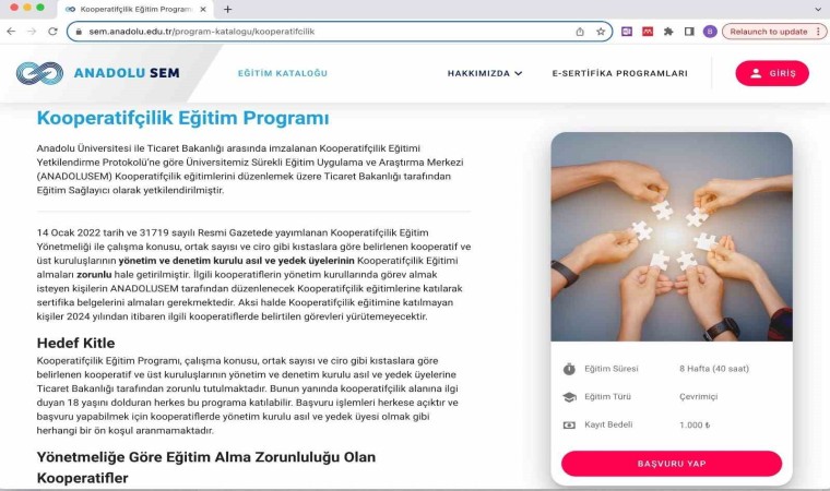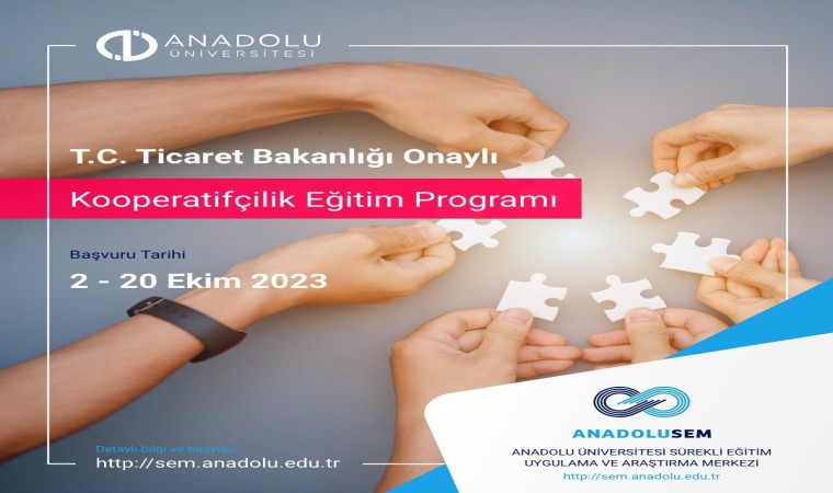 Kooperatifçilik Eğitim Yönetmeliği ekinde yer alan müfredata uygun olarak ANADOLUSEM bünyesinde 30 ders saati Temel Konular, 10 ders saati Destekleyici Konular olmak üzere toplam 40 ders saatini içeren Kooperatifçilik Eğitim Programı hazırlandı. Programa kayıt başvuruları 2 Ekim itibariyle başladı. Başvuru işlemleri ise 20 Ekim’e kadar devam edecek. Kayıt döneminin ardından internet üzerinden çevrimiçi ortamda gerçekleşecek canlı dersler 30 Ekim’de başlayacak. Kooperatifçilik Eğitim Programını tamamlayan katılımcılara katılım belgesi verilecek ve e-Devlet Kapısında yer alan Ticaret Bakanlığı KOOPBİS sistemine işlenecek.
