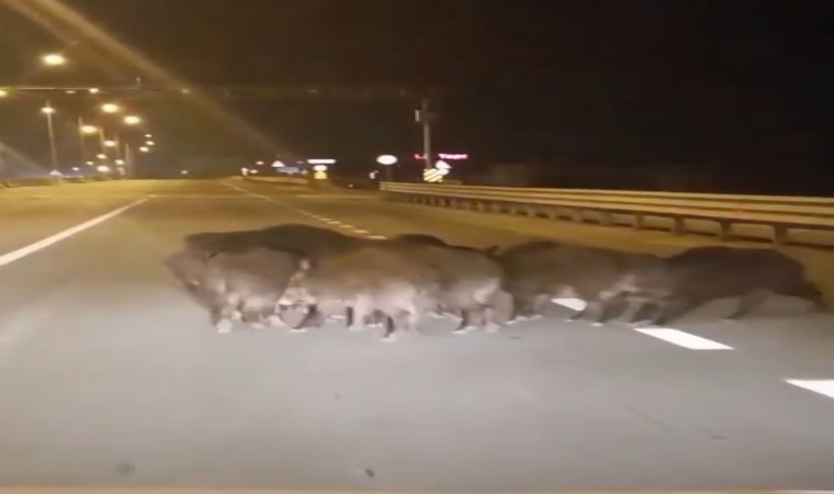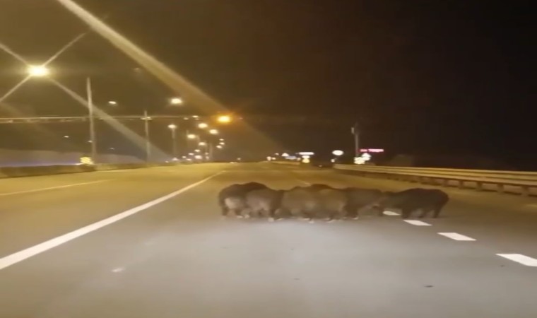 Mudanya ilçesi Mudanya Yolu üzerinde hızla seyreden otomobiller, yol üzerindeki karaltıyı görünce yavaşlamak zorunda kaldı. Cadde üzerine çıkan çok sayıda irilik ufaklı domuz, bir süre sağ şeridi işgal etti. Kaza yapmaktan son anda kurtulan otomobildekiler, cep telefonu kameralarıyla o anları saniye saniye kaydetti.