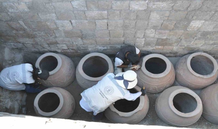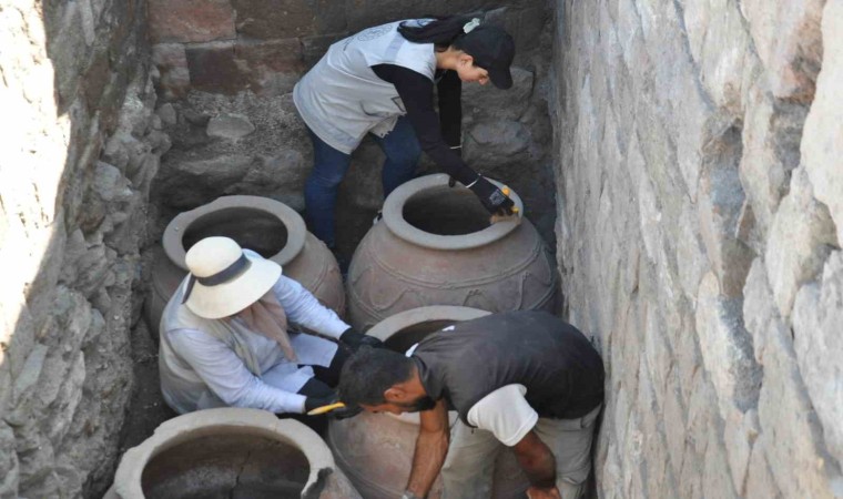 Geçtiğimiz günlerde ortaya çıkarılan İlk Kaya Mescidi’nin ardından şimdi de yürütülen çalışmalarda Büyük Selçuklu dönemine tarihlenen erzak deposu içerisinde yaklaşık 1,5 metre yüksekliğe sahip 8 küp gün yüzüne çıkarıldı.