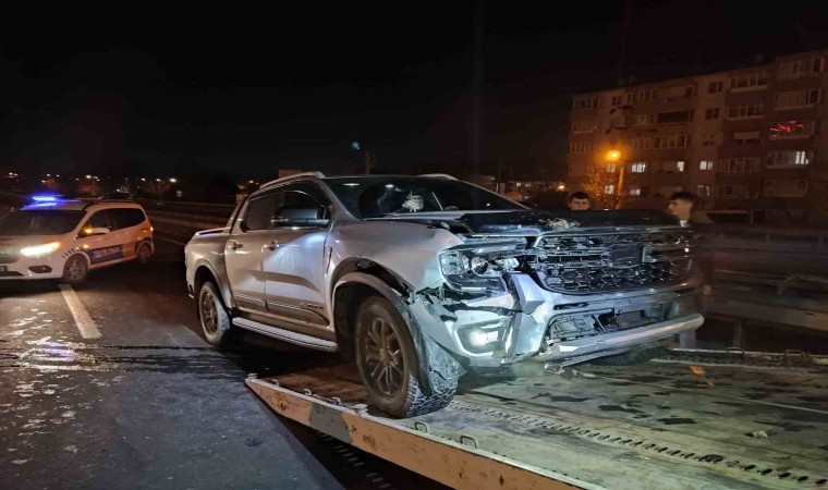 Edirne’nin Keşan ilçesinde meydana gelen kazada, aniden yola çıkan başıboş inek ve buzağıya kamyonet çarptı.
