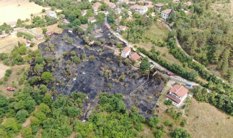 Yaklaşık 45 dönümlük alanda etkili olan yangının verdiği zarar dron ile görüntülenirken olayla ilgili inceleme başlatıldı.
