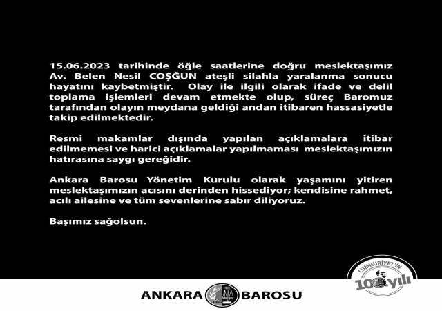 Ankara Barosu, ateşli silahla yaralanma sonucu hayatını kaybeden Avukat Belen Nesil Coşğun'un ölümünü duyurdu. Baro tarafından yapılan açıklamada, 15.06.2023 tarihinde öğle saatlerinde meydana gelen trajik olay sonucu meslektaşlarının hayatını kaybettiği bildirildi. Açıklamada, olayın incelenmesi ve delillerin toplanması sürecinin devam ettiği belirtildi ve olayın başından beri Baro tarafından yakından takip edildiği vurgulandı.
