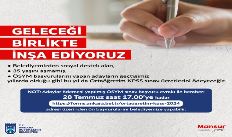 Ankara Büyükşehir Belediyesi, sosyal destek alan ailelerin 35 yaşını aşmamış adayların ‘2024 KPSS Ortaöğretim Sınavı’na ait başvuru ücretlerini karşılayacak. ÖSYM başvurularını yapan adaylar, ‘2024 KPSS Ortaöğretim Başvuru Belgesi’ni en geç 28 Temmuz 2024 tarihine kadar sisteme yükleyerek başvuruda bulunabilecek.