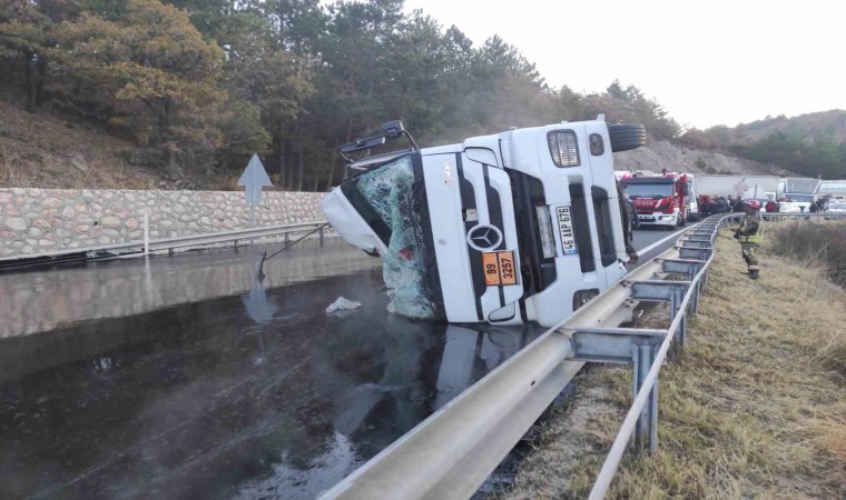 Ankara-İstanbul D-750 karayolunda asfalt malzemesi yüklü tırın devrilmesi sonucu sürücü yaralandı.