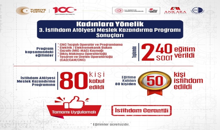 Ankara Kalkınma Ajansı, sanayide kadın istihdamını artırmak için istihdam garantili meslek edindirme kursları düzenliyor. “Kadın Girişimciliği ve Kadın İstihdamı” teması ile kadınlara özel 3. İstihdam Atölyesi Meslek Kazandırma Programı düzenlendi. Programa kabul edilen 80 kadın kursiyerden 50’si istihdama kazandırıldı.