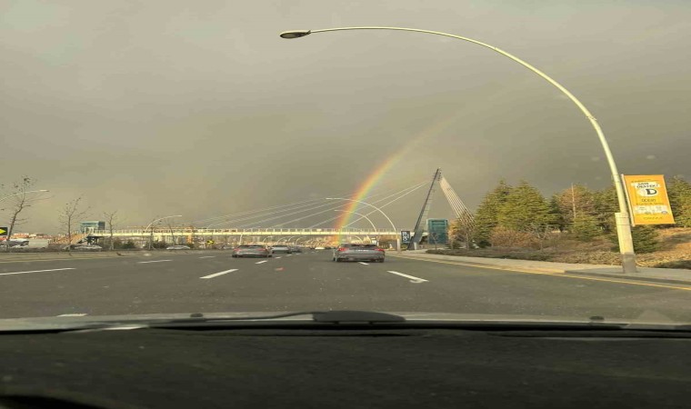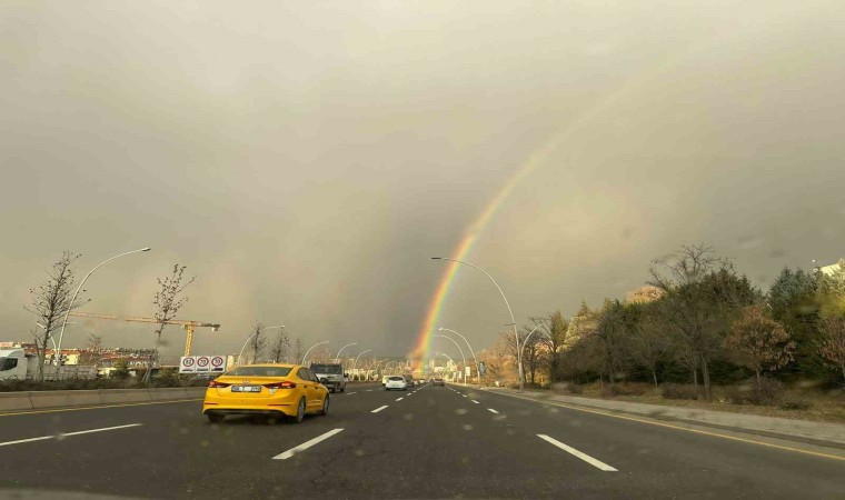 Ankara’nın Pursaklar ilçesinde akşam saatlerinde etkili olan sağanak sonrası gökyüzünde oluşan gökkuşağı kartpostallık görüntüler oluşturdu.