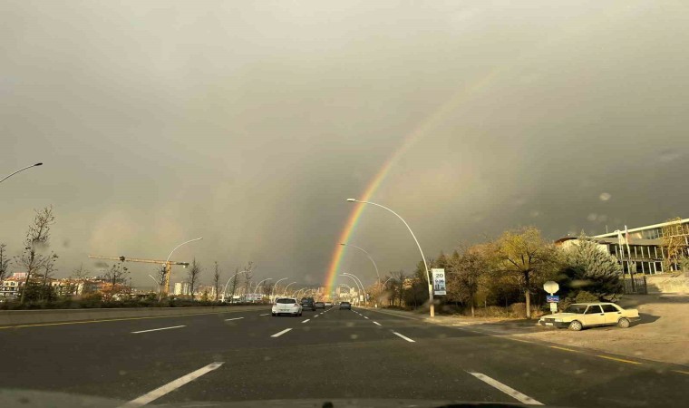 Pursaklar ilçesinde akşam saatlerinde etkili olan sağanak yağışın ardından gökyüzünde gökkuşağı ortaya çıktı. Gökkuşağı kartpostallık görüntüler oluşturdu.