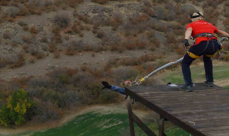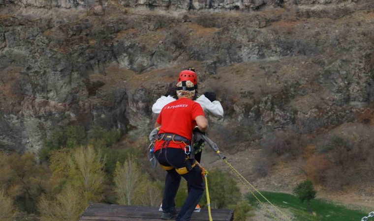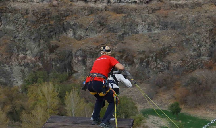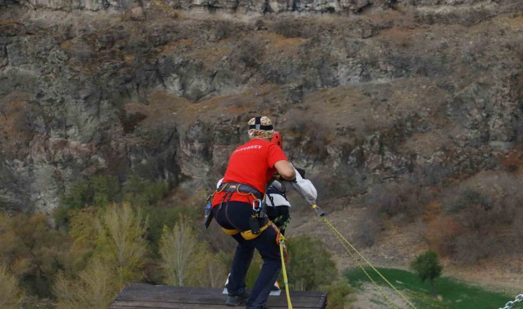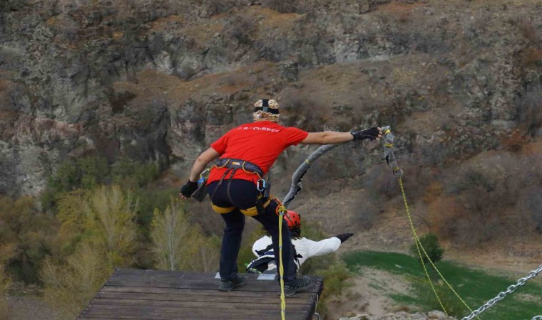 Ankara’nın Güdül ilçesinde halatla atlama (Rope jumping) sporuyla uğraşan yüzlerce kişi, adrenalinin tavan yaptığı 70 metre yüksekliğindeki kayalıktan atlayarak heyecanlı anlar yaşadı.