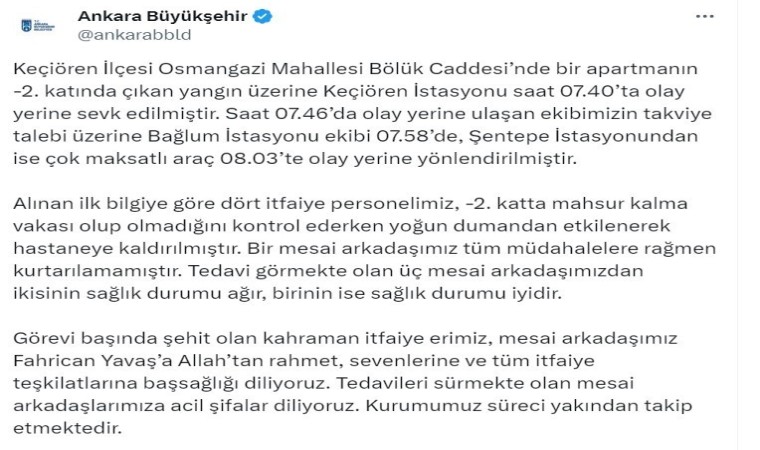 Ankara Büyükşehir Belediyesi, Keçiören ilçesinde çıkan yangında 1 itfaiye erinin şehit olduğunu, dumandan etkilenen 2 itfaiye erinin ise durumunun ağır olduğunu açıkladı.