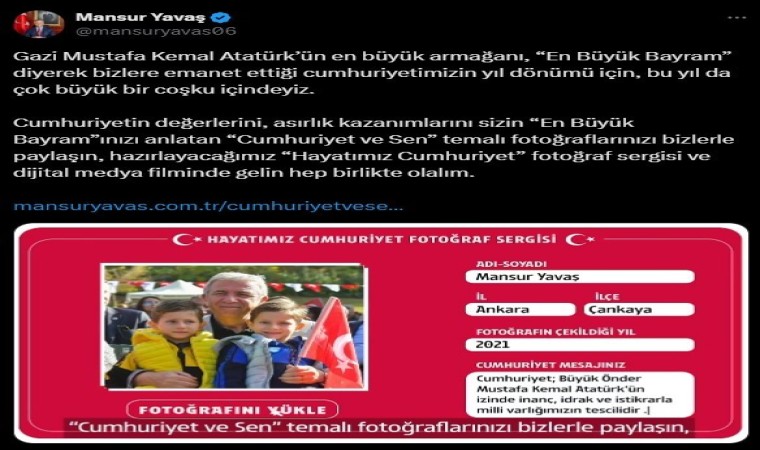Sosyal medya hesaplarından yaptığı paylaşımla Büyük Önder Gazi Mustafa Kemal Atatürk’ün “Bugün en büyük bayramdır. Kutlu olsun” sözünden ilham alarak bu yıl da aynı coşkuyu tüm Türkiye’de hissettirmeye çalıştıklarını belirten Ankara Büyükşehir Belediye Başkanı Mansur Yavaş, “Gazi Mustafa Kemal Atatürk’ün en büyük armağanı, ‘En büyük bayram’ diyerek bizlere emanet ettiği Cumhuriyet’imizin yıldönümü için bu yıl da çok büyük bir coşku içindeyiz. 29 Ekim 1923’te ilk olarak Ankara’da yankılanan ve ertesi sabah kadın, erkek, genç, yaşlı ellerinde bayraklarla ‘Yaşasın Cumhuriyet’ diyerek candan, samimi kutlamalar yapan büyük Türk milletinin o kenetlenmiş ruhunu, 101 yıl sonra da aynı heyecanla tüm Türkiye’de hissediyoruz. Edirne’den Kars’a, Sinop’tan Hatay’a 81 ilimizden sizlerin bu coşkusunu Cumhuriyet’imizin doğduğu, kuvvet bulduğu, Türkiye’mizin kalbi Ankara’da sizlerle birlikte taçlandırmak istiyoruz. Cumhuriyet’in değerlerini, asırlık kazanımlarını sizin ‘en büyük bayramınızı anlatan ‘Cumhuriyet ve Sen’ temalı fotoğraflarınızı bizlerle paylaşın, hazırlayacağımız ‘Hayatımız Cumhuriyet’ fotoğraf sergisi ve dijital medya filminde gelin hep birlikte olalım” dedi.