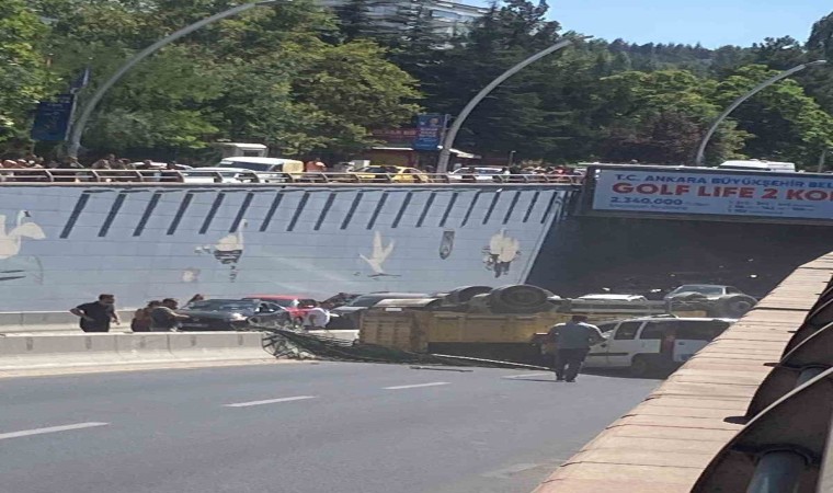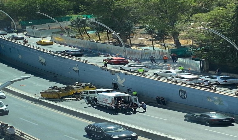 Ankara’nın Çankaya ilçesinde hafriyat kamyonu alt geçide düştü.