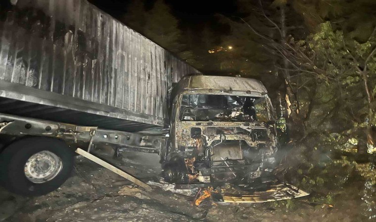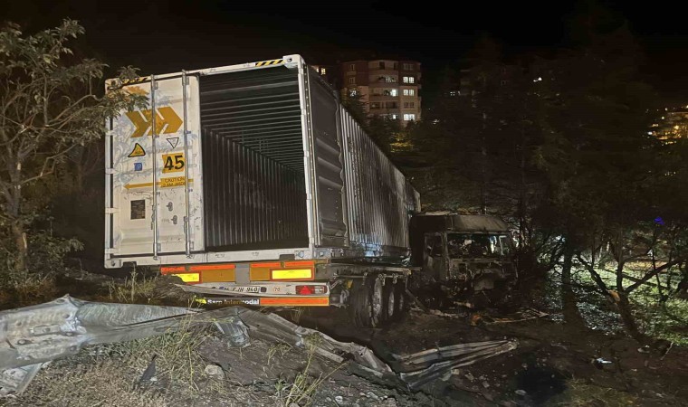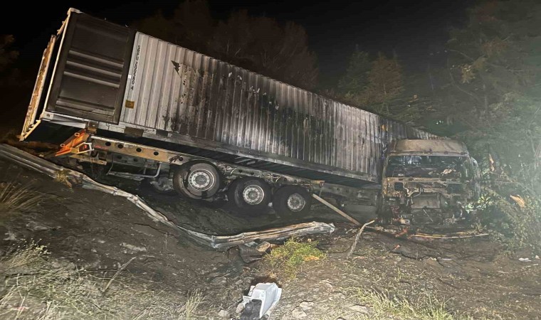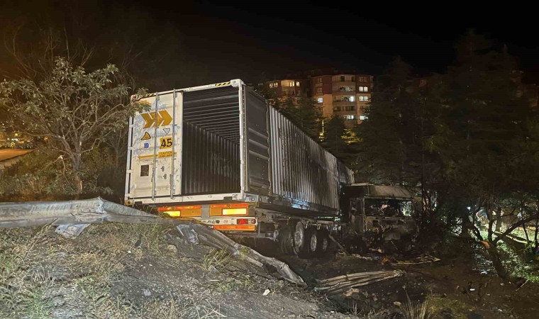 Ankara’nın Elmadağ ilçesinde kontrolden çıkan tır demir bariyerleri aşarak şarampole yuvarlandı. Alev alan tır kullanılamaz hale geldi.
