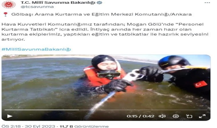 MSB, sosyal medya hesabından yaptığı paylaşımda, “Hava Kuvvetleri Komutanlığımız tarafından; Mogan Gölü’nde “Personel Kurtarma Tatbikatı” icra edildi. İhtiyaç anında her zaman hazır olan kurtarma ekiplerimiz, yaptıkları eğitim ve tatbikatlar ile hazırlık seviyesini artırıyor” ifadelerine yer verildi. Paylaşım kısa sürede çok sayıda beğeni aldı.