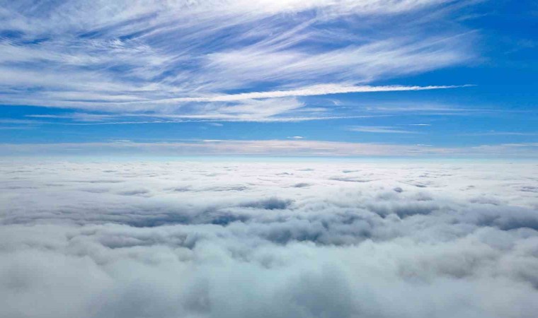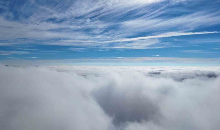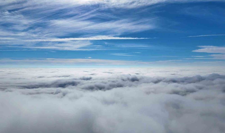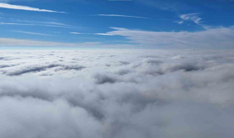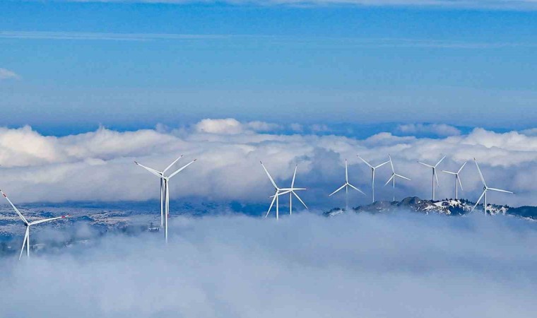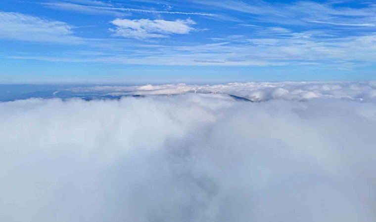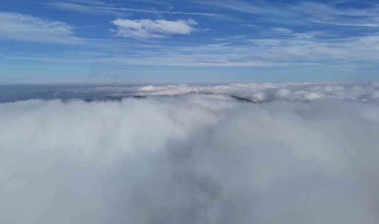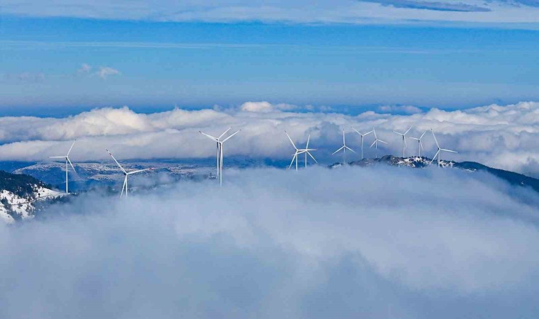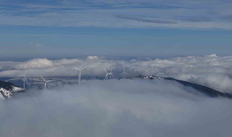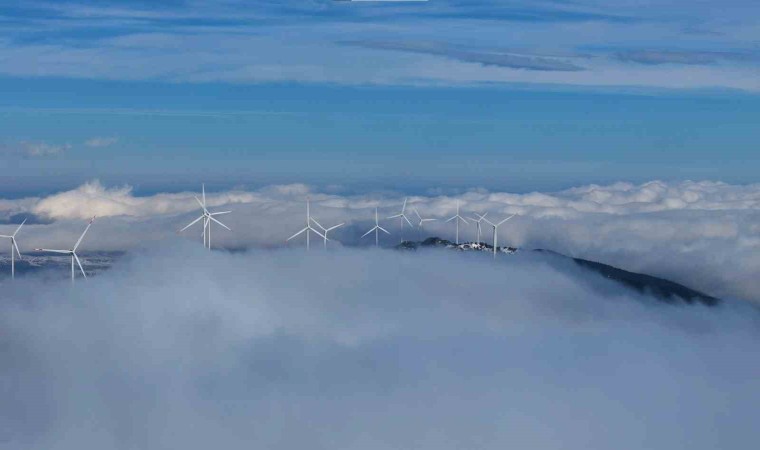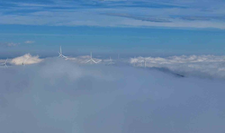 Yoğun sis tabakası arasında yükselen türbinler, hareket eden kanatlarıyla dinamik ve sakin bir atmosfer oluştururken, sis içinden süzülen güneş ışıkları ise manzarayı daha da etkileyici kılarak altın tonlarında bir ışıltı sundu.