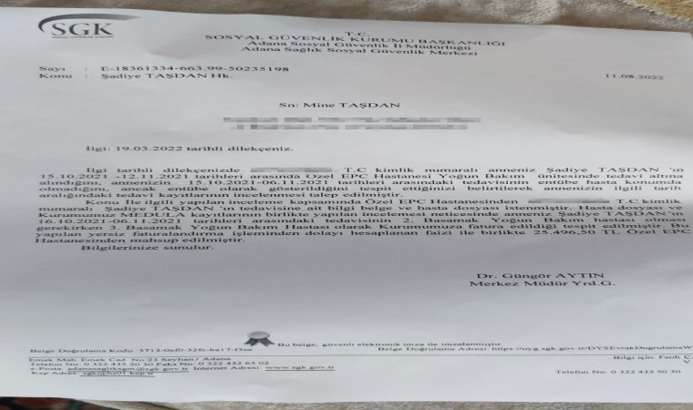 ADANA (İHA) – Adana’da annesinin ölümünde şüphe olduğu iddiasıyla hukuk mücadelesi veren kadının çabası özel hastanenin fatura oyununu ortaya çıkardı. Sosyal Güvenlik Kurumunun (SGK) yaptığı incelemede, hastanenin yaşlı hastanın 2’nci derece yoğun bakım hastası olması gerekirken 3’üncü derece olarak gösterilip usulsüz fatura edilerek devletten fazla para aldığını tespit edip, faizliyle birlikte hastaneden 25 bin 496 lira 50 kuruş parayı tahsil etti.