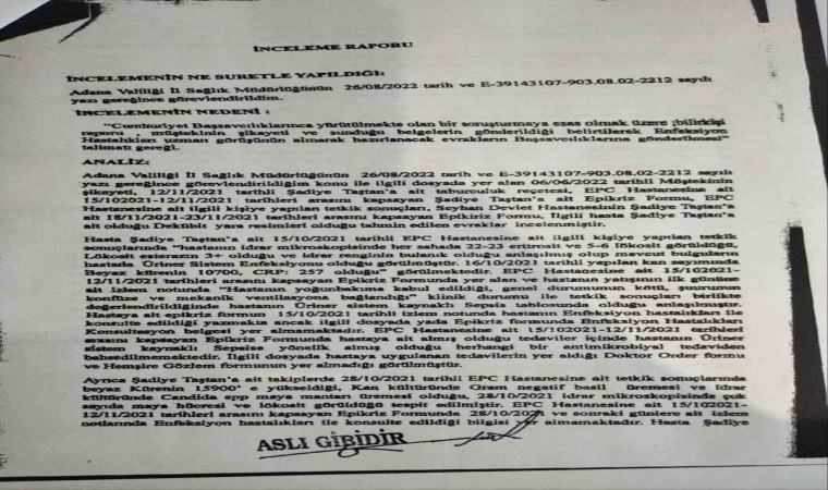 Seyhan ilçesi Yurt Mahallesi’nde oturan 4 çocuk annesi Şadiye Taşdan, 15 Ekim 2021’de ateşlenip fenalaşınca, kaldırıldığı özel EPC Hastanesi’nde tedaviye alındı. İdrar yolları enfeksiyonu tanısıyla tedavi olup, 28 gün sonra taburcu edilen Taşdan, kızı Mine Taşdan’ın evine döndü.