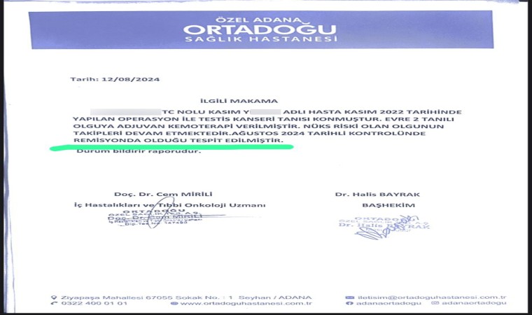 Öte yandan, mahkemeye sunulan kanser hastası raporunun ise özel bir hastaneden alındığı ve raporda ’2022 yılında testis kanseri tanısı konmuştur. Nüsk riski olan olgunun takipleri devam etmektedir. Ağustos 2024 tarihli kontrolünde remisyonda (hastalık aktivitesinin bulunmadığı) olduğu tespit edilmiştir’ yazıldığı görüldü.