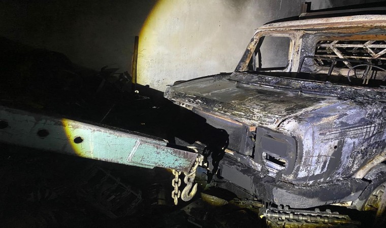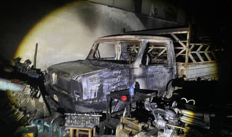 Hatay’da park halindeyken motor kısmı yanan kamyonet kullanılmaz hale geldi.