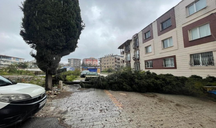 Hatay’ın Antakya ilçesinde kuvvetli fırtınanın etkisiyle ağaç yola devrildi.