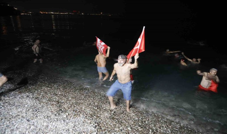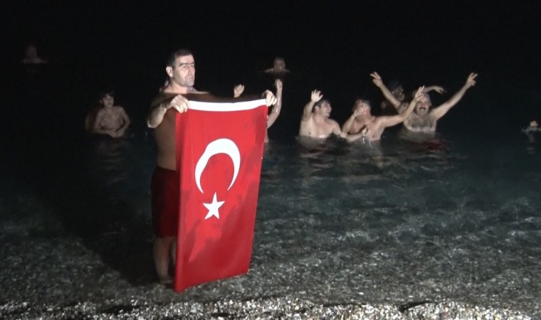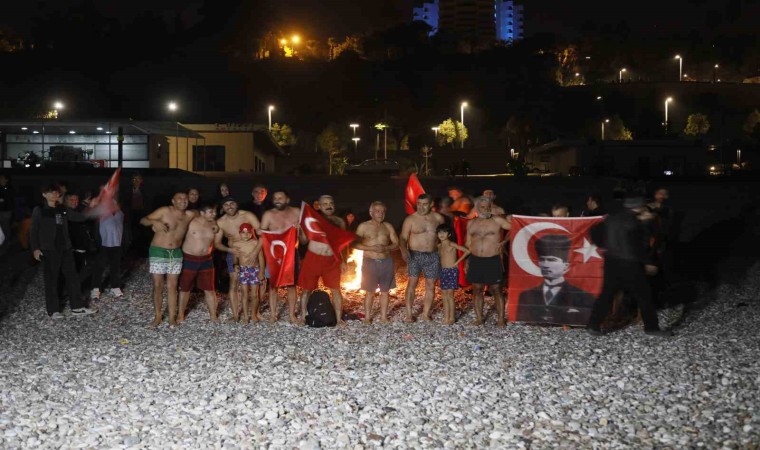 Konyaaltı Sahili’ne eşleri ve çocuklarıyla gelen ’Yaz Kış Denize Girenler’ adlı grup üyeleri, ısınmak için sahilde ateş yaktı. Türk bayrakları ve Atatürk posterleriyle bir süre sahilde vakit geçiren grup, geri sayımın ardından saat 00.00’da denize girdi. Havai fişekler eşliğinde grup üyeleri kendilerini hava sıcaklığının 12, deniz sıcaklığının ise 20 derece ölçüldüğü sahilde sulara bıraktı. Grup üyeleri bir süre denizde kulaç atarak, yanlarında getirdikleri Türk bayrakları ve Atatürk posterlerini açtı. Aralarında öğretmen, mühendis, iş adamları ile farklı mesleklerden kişilerin bulunduğu grup, 2024 yılını denize girerek karşıladı.