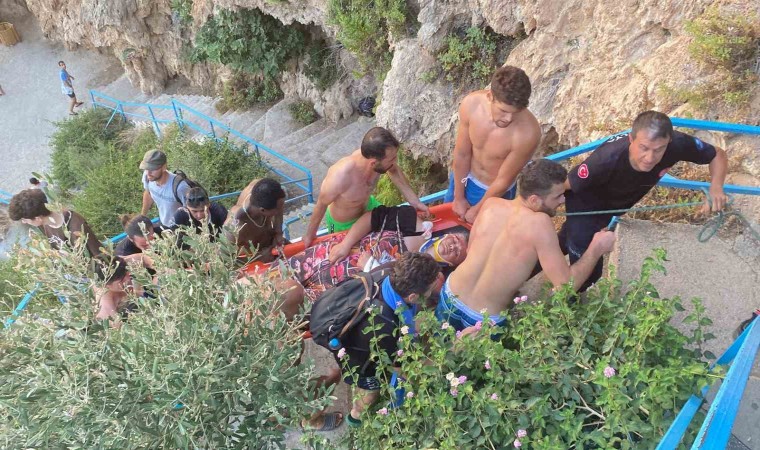 İtfaiye ekipleri tarafından sedyeye alınan kadın çıkarılmakta güçlük çekilince vatandaşlardan ve turistlerden yardım istendi. Yaklaşık 1 saat süren çalışmanın ardından kadın falezlerin üzerine çıkarılarak ambulansa alınıp özel bir hastaneye kaldırıldı. Kendini ifade edemeyen kadının üzerinden ise kimlik çıkmadı. Polisin olayla ilgili incelemesi devam ediyor. Kadının çıkarılmasında görev alan Osman Utgunoğlu, "Hanımefendi düşerek yaralanmış. Denizden alınamadı, insanların yardımı ile yukarı çıkardık. Kafasını çarpmış, yorucu bir mücadele oldu. Yardım eden herkese teşekkür ederiz." dedi.