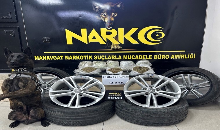 Bir diğer operasyonda ise Manavgat ilçesinde bulunan kargo işletmesinde yapılan aramada 4 adet araç lastiği içerisine ikişer paket hâlinde toplam 8 paket içerisinde zulalanmış şekilde daralı 4 kilogram esrar maddesi tespit etti.