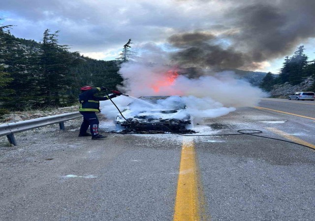 Antalya’nın Akseki ilçesinde hareket halindeki otomobil birden alev alırken, itfaiye ekipleri tarafından söndürülen araç kullanılamaz hale geldi.