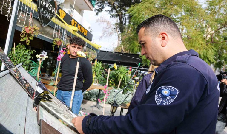 Antalya Büyükşehir Belediyesi Zabıta Dairesi Başkanlığında görevli personel tarafından lokanta, restoran, kafe ve pastanelerin fiyat listelerini giriş kapısı ve masalara koyması zorunluluğuna yönelik denetim gerçekleştirdi. Yapılan denetimlerde çalışmalarını tamamlamayan esnaf uyarılırken, kaldırım yolu üzerindeki engelli yoluna yakın bırakılan masa, sandalye ve motosiklet kaldırıldı.