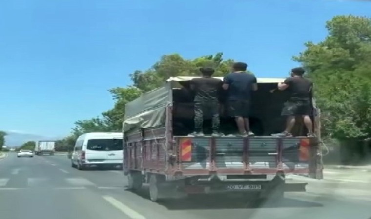 Olay, Alanya D-400 Karayolu üzerinde meydana geldi. 20 VF 985 plakalı bir kamyonetin kasasının kapağına kimliği belirsiz 3 kişinin ayakta tutunarak hiçbir şey yokmuş gibi yolculuk etmesi dikkat çekti. Güvenlik tedbiri olmadan kamyonetin kasasında ayakta metrelerce seyreden 3 kişi yoldaki araçları da tehlikeye soktu.
