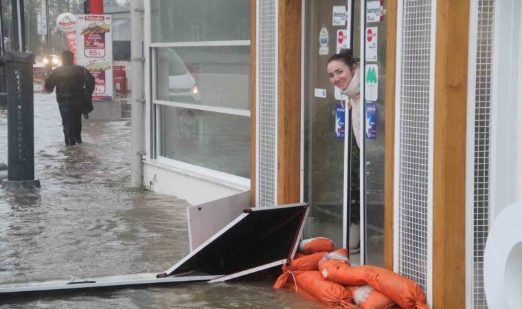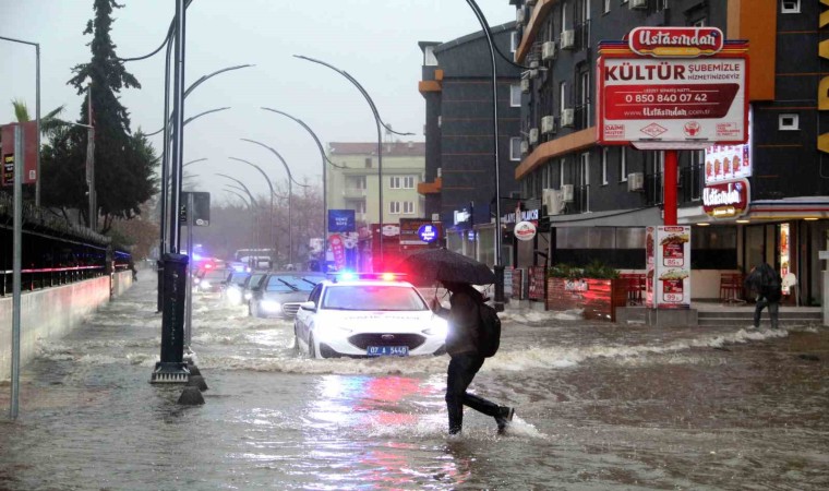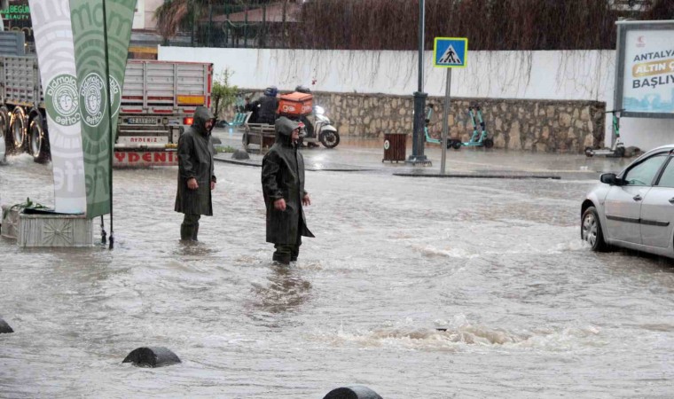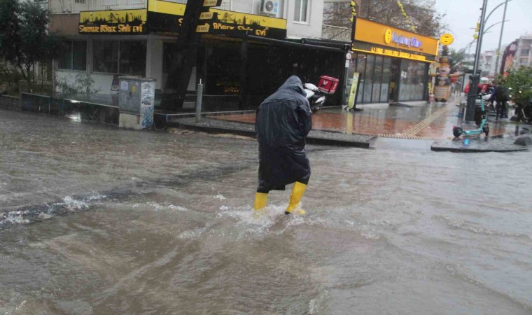 Antalya’da etkili olan sağanak yağış hayatı olumsuz etkilerken, cadde ve sokaklar dereye döndü. Bir esnaf iş yerine su girmemesi için araç sürücülerini tehlikeye rağmen uyarmaya çalıştı.