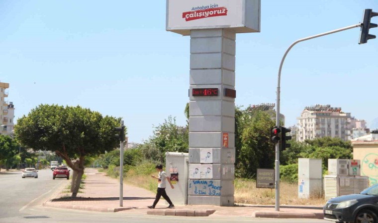 Turizm kenti Antalya’da hafta başından bu yana sıcak hava etkisini artırmaya başladı. Meteoroloji Genel Müdürlüğü’nün uyarısı sonrası kentte sıcaklıklar hissedilir derecede yükseldi. Konyaaltı ilçesinde Büyükşehir Belediyesi saatinde bulunan kule şeklindeki reklam tabelasında termometre 46’ya ulaştı. Vatandaşlar ve turistlerin adresi dünyaca ünlü Konyaaltı Sahili olurken, plajların diğer günlere göre fazla kalabalık olmadığı görüldü. Plajlara gelenlerin şemsiye altında oturduğu, serinlemek için denize girenlerin ise şapka taktığı gözlemlendi. Sahildeki parklardaki gölgelik alanlarda vatandaşlarca kullanıldı. Sıcak hava nedeniyle başta Cumhuriyet Meydanı olmak üzere cadde ve sokaklarda çok az kişinin yürüdüğü görüldü. Dışarıya çıkanlar güneşten korunmak için şemsiye de kullandı. Yüksek sıcaklıkların hafta başına kadar etkisini sürdüreceği bildirildi.
